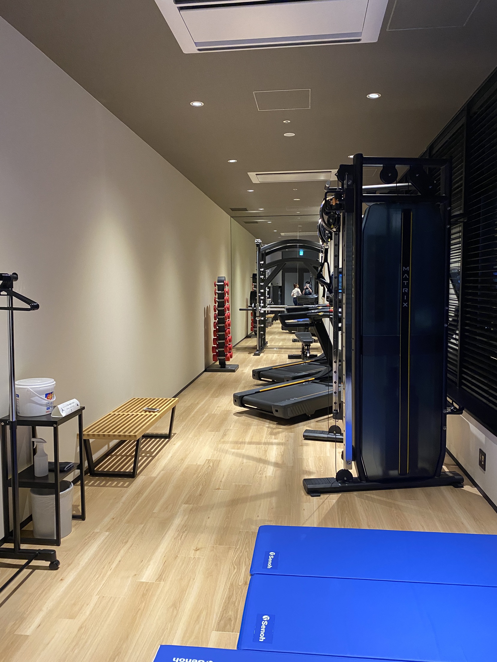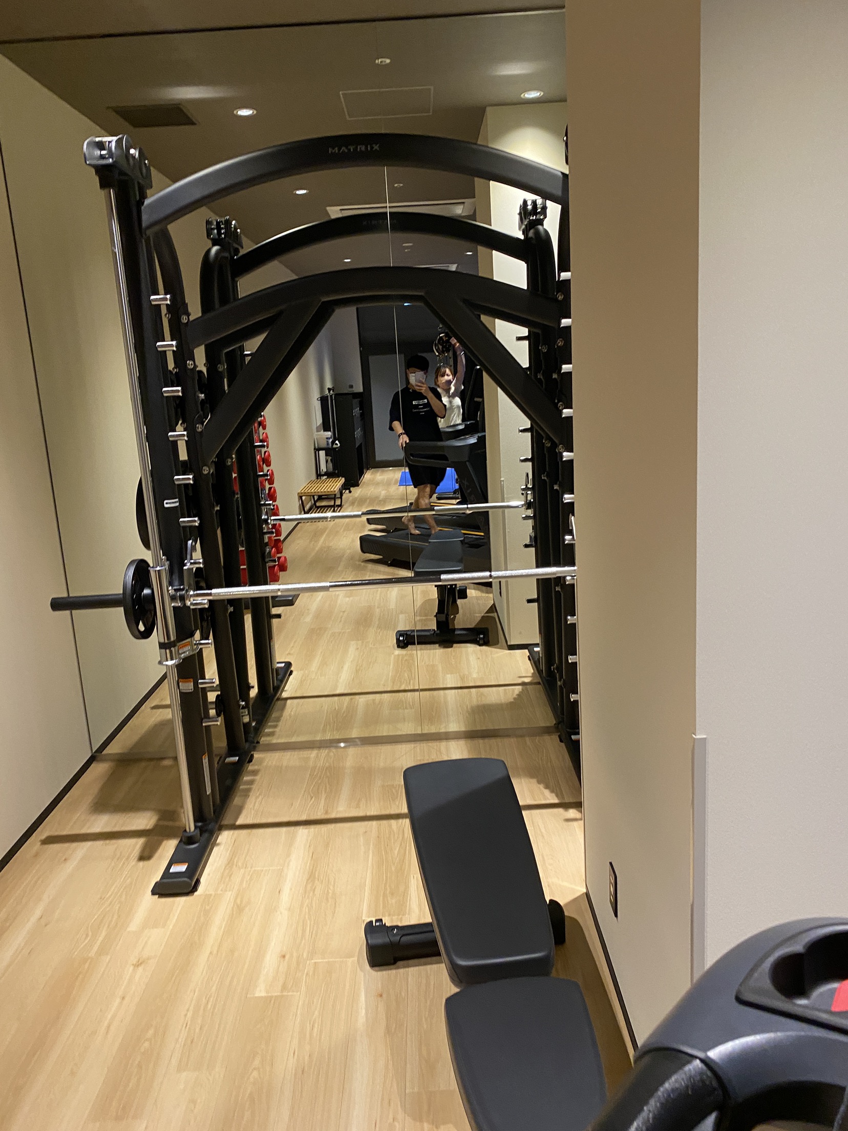 바로 옆에는 헬스장이 있어요. 크기는 크지 않지만 런닝머신 2개와 덤벨 운동이 가능한 기구까지 구비되어 있습니다.