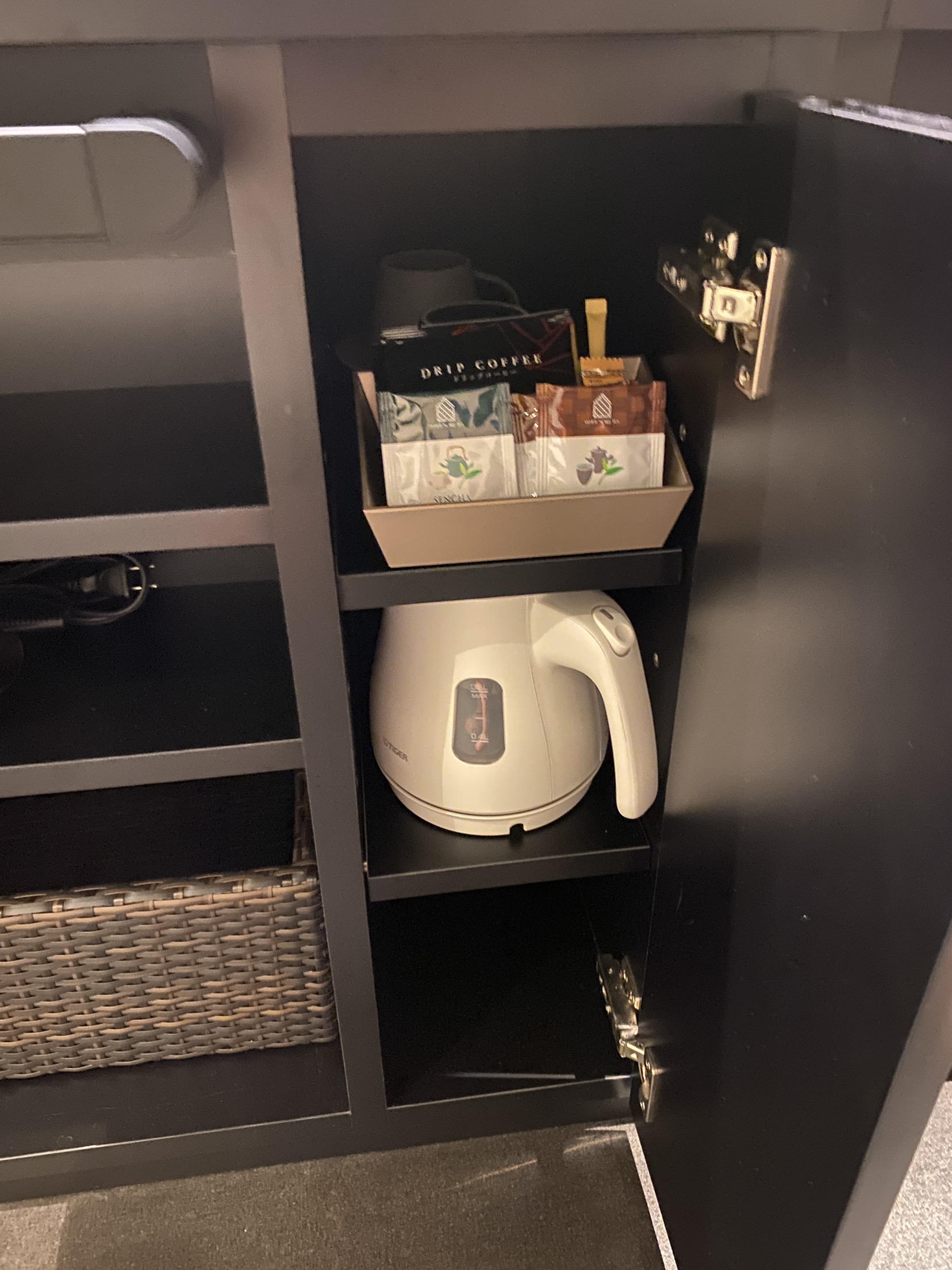 냉장고 옆 수납장 안에는 커피포트와 커피, 차 등이 구비되어 있습니다.