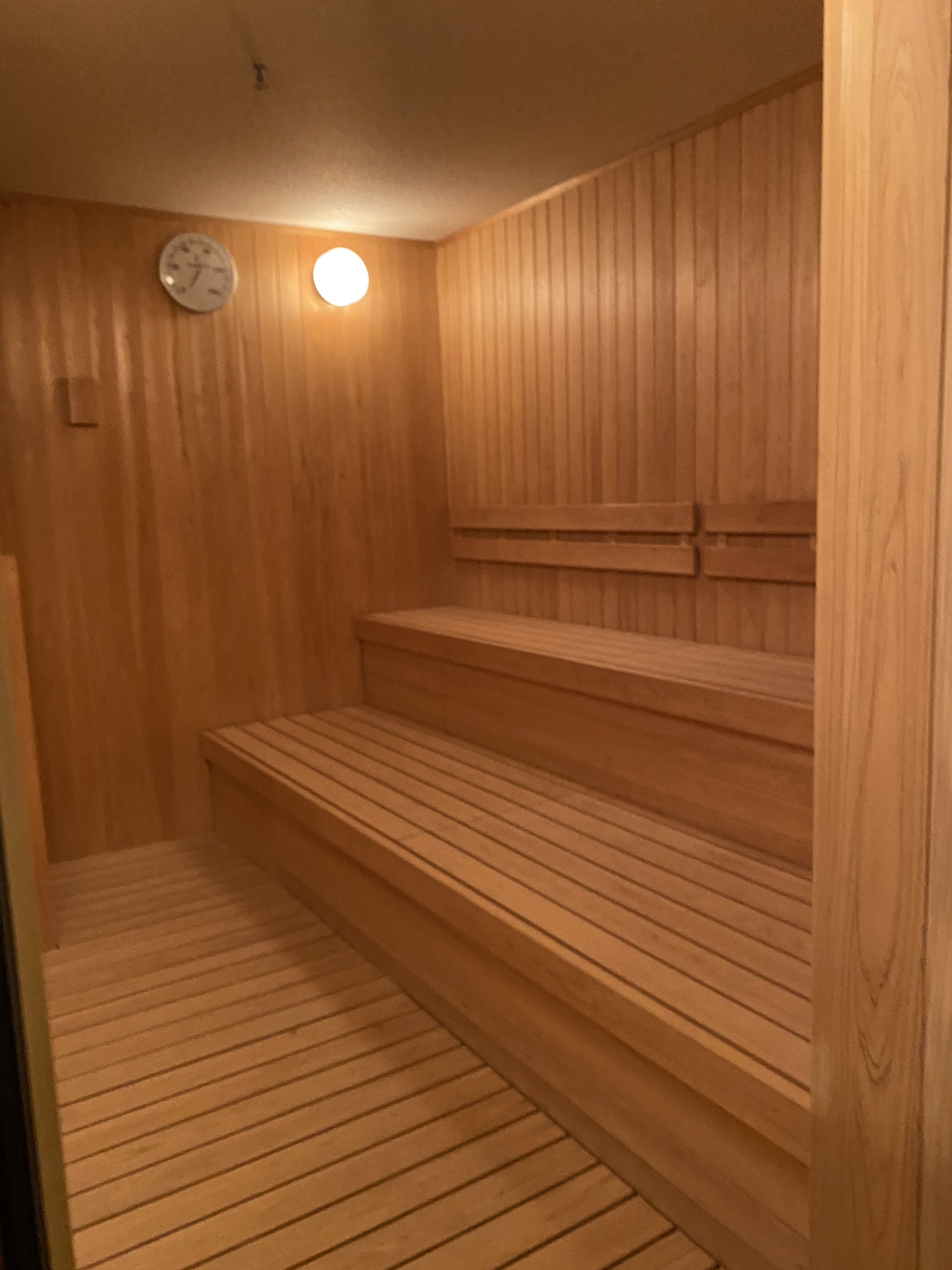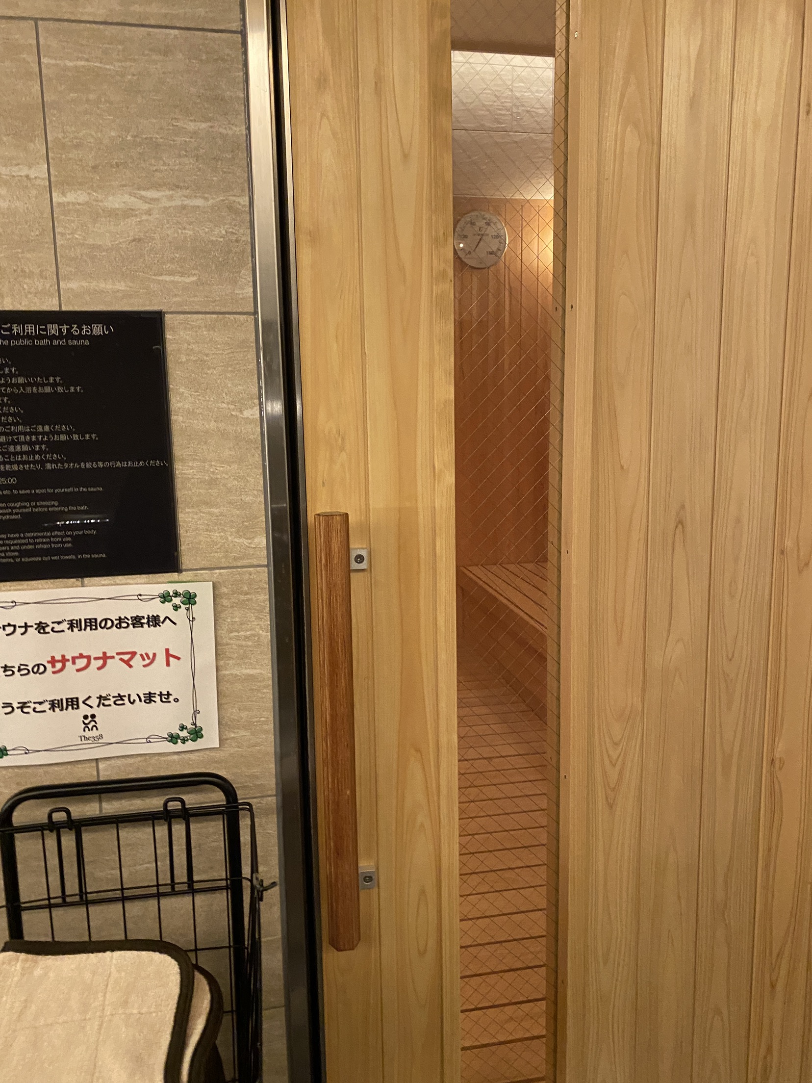 사우나도 있는데 입구에는 엉덩이가 뜨거우니 깔고 앉을 매트도 구비되어 있어요.