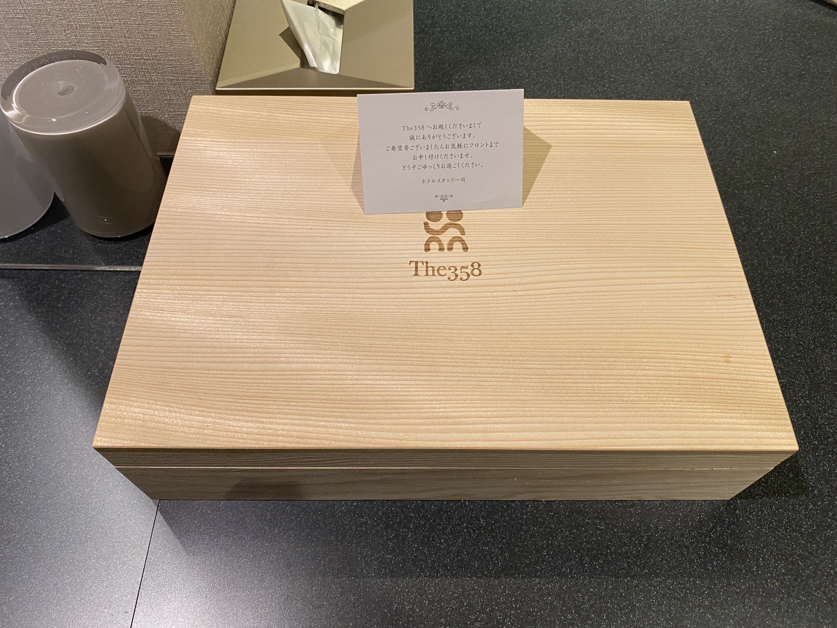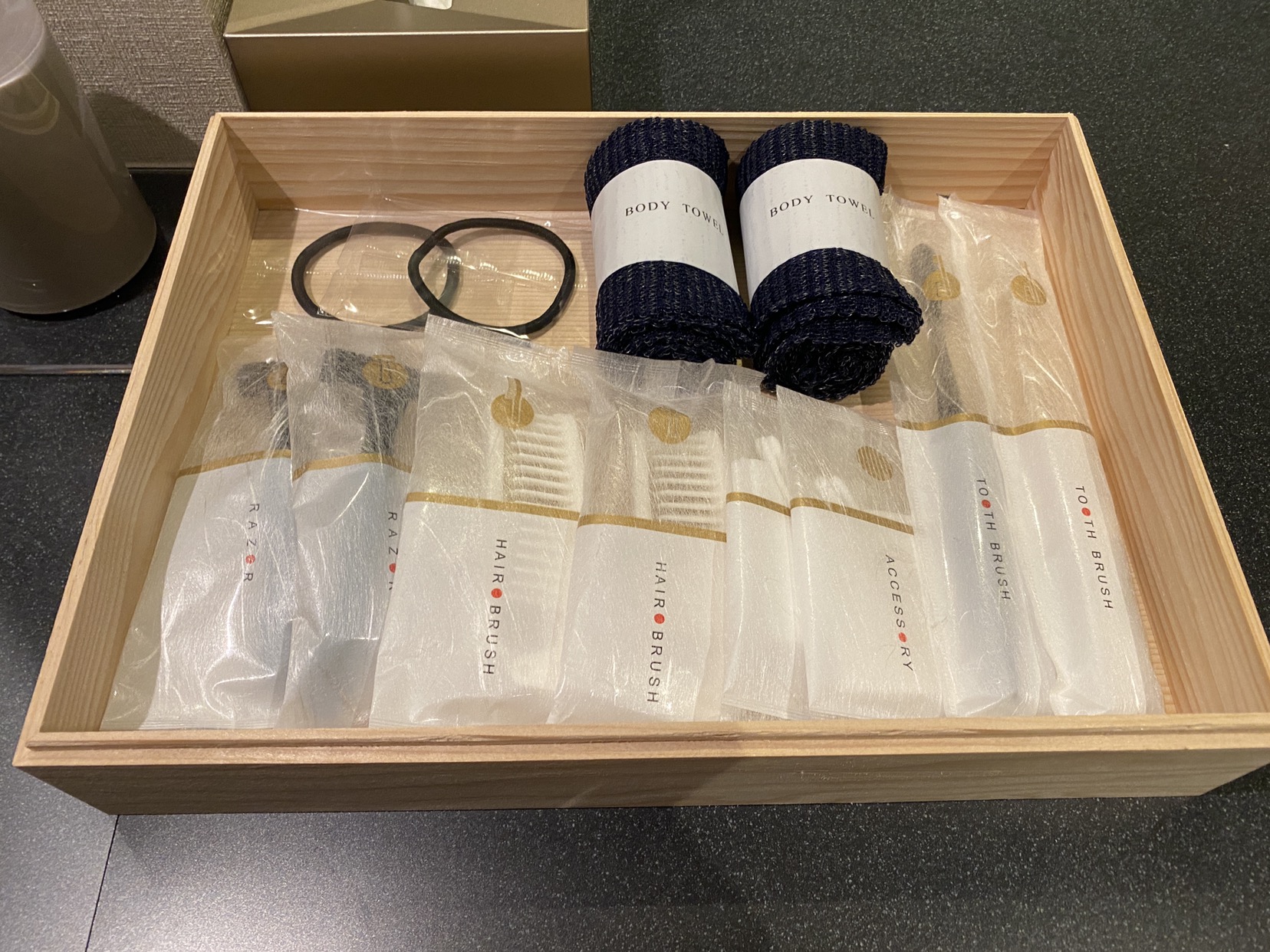호텔 이름이 적힌 나무상자 안에는 칫솔과 면도기, 빗 등이 들어있습니다.