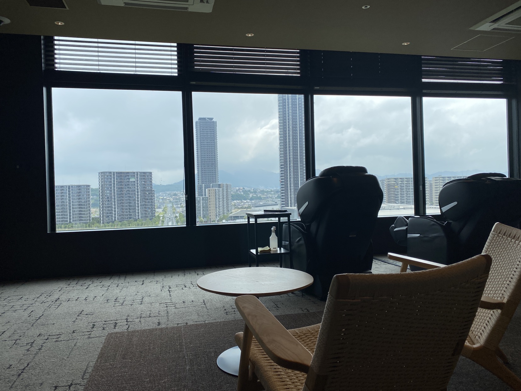 이 사진은 다음날 아침에 찍은 사진인데 창가 쪽에 안마의자도 배치되어 있어요. 전날은 깜깜해서 아무것도 안보였지만 날이 개니 주변이 탁 트인 게 힐링되기 딱이에요.