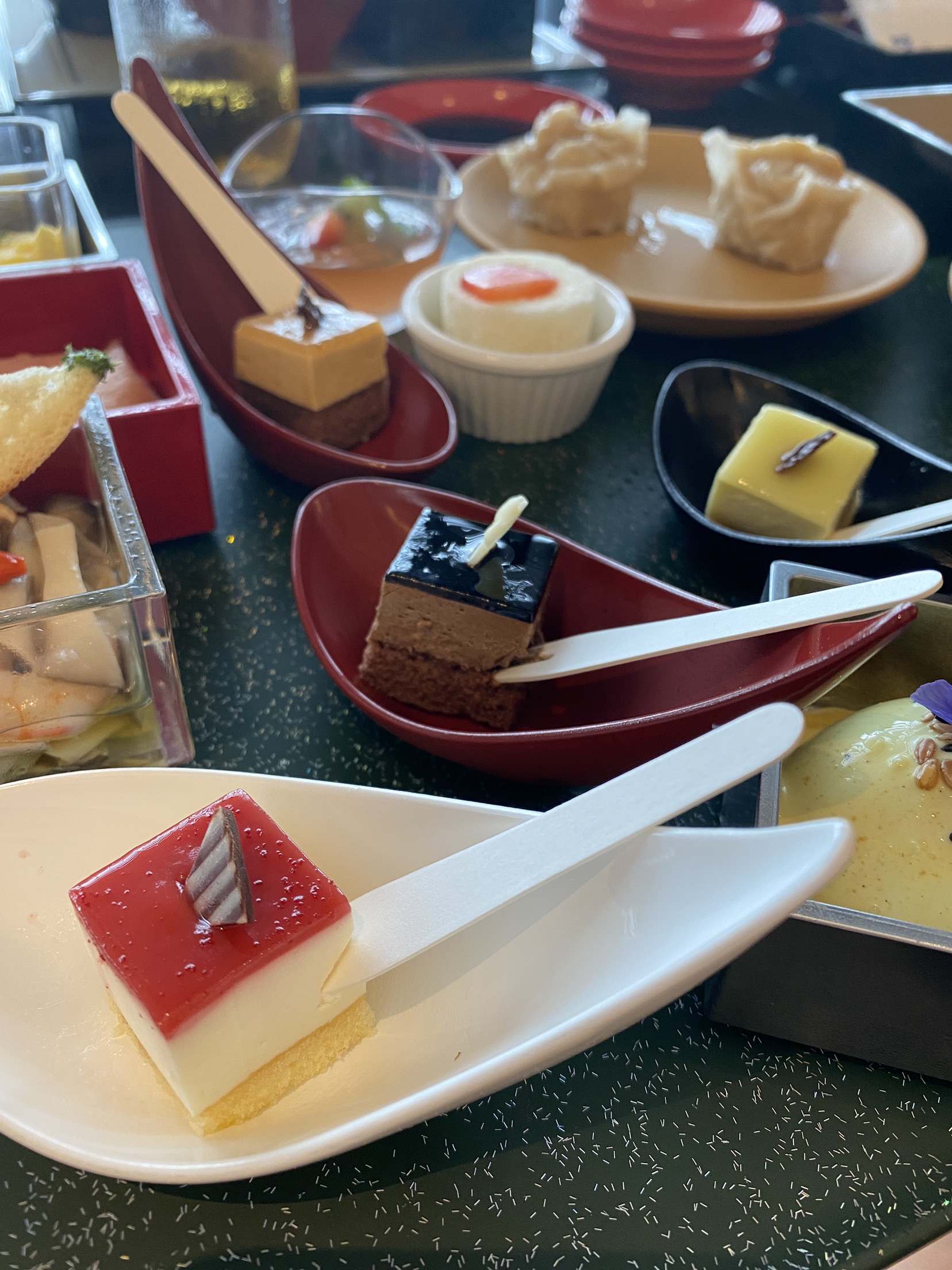 접시도 엄청 이뻐요! 저는 다른 호텔에서는 보지 못한 접시들이에요. 뷔페식이면 큰 접시에 음식을 담아먹는 형식인데 이곳은 큰 네모난 접시가 있어서 그 위에 작은 접시들을 올려놓는 식이에요.