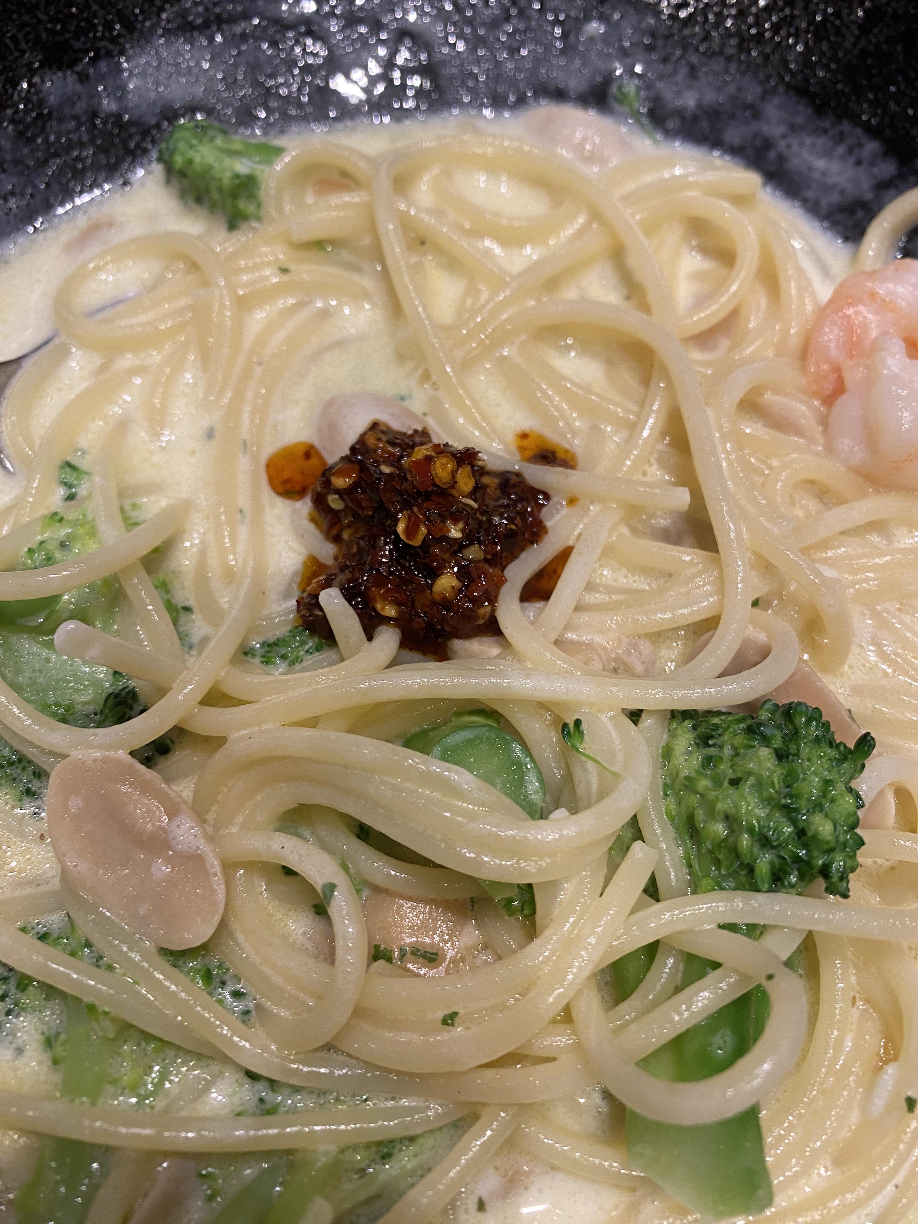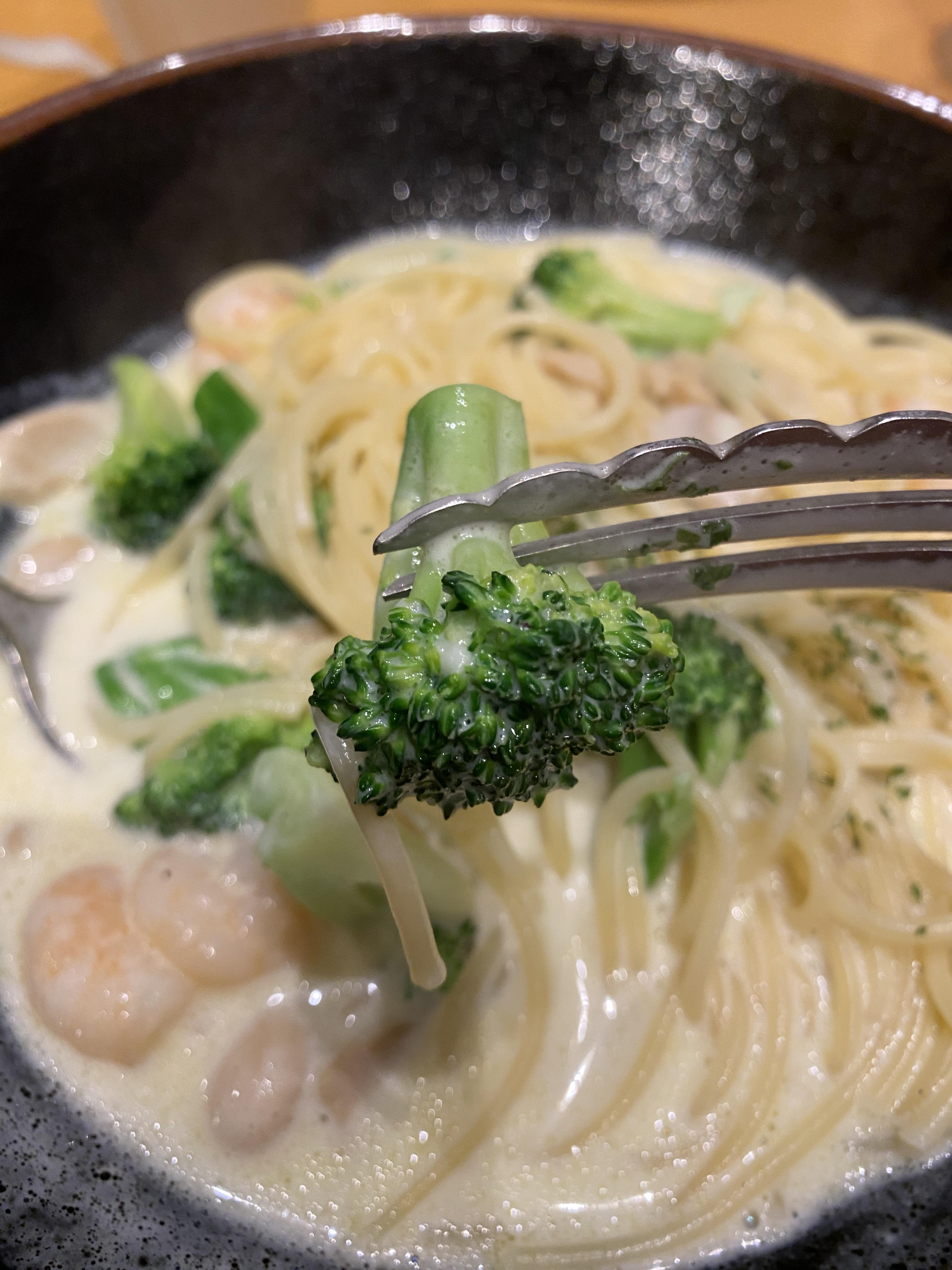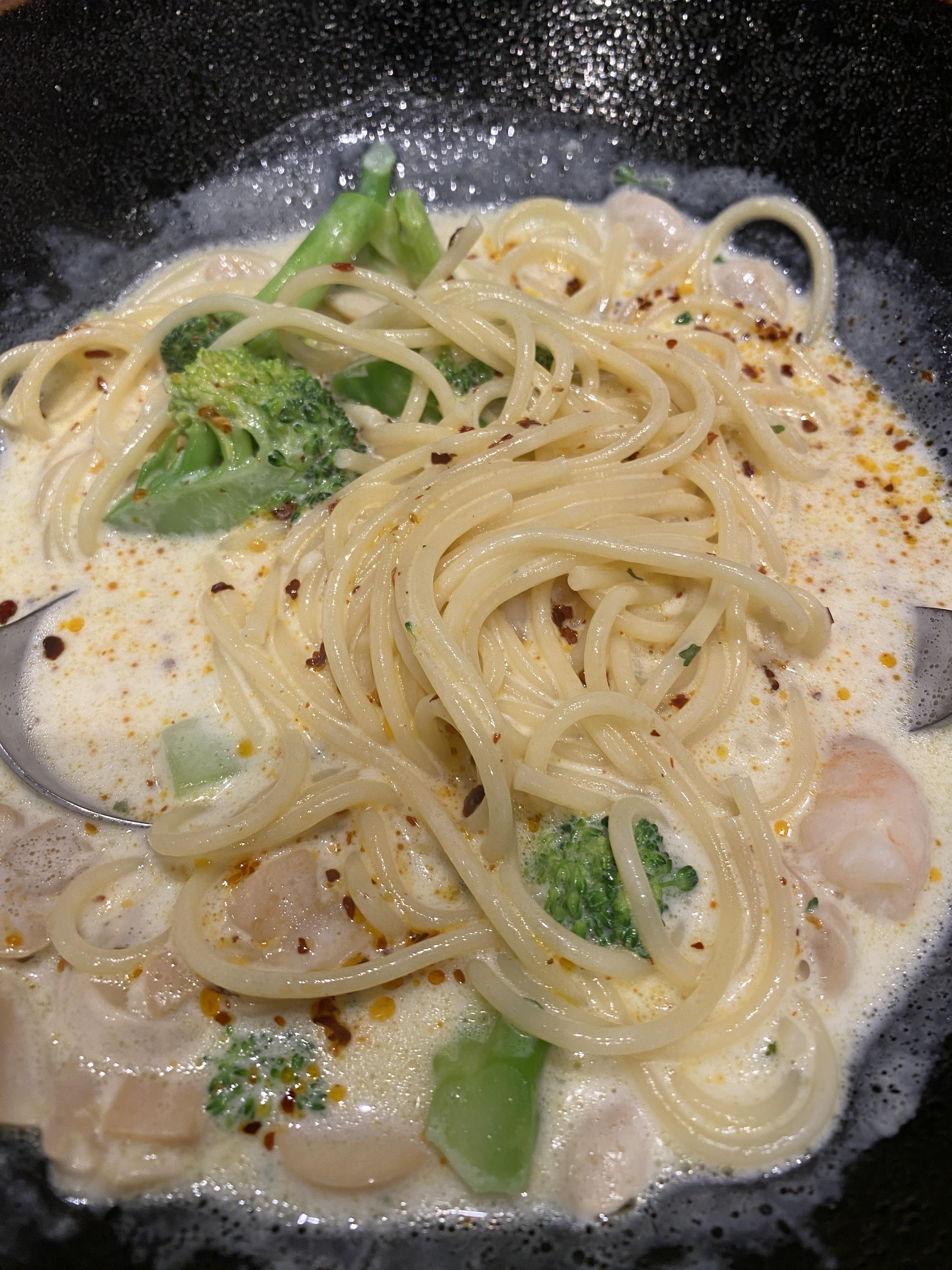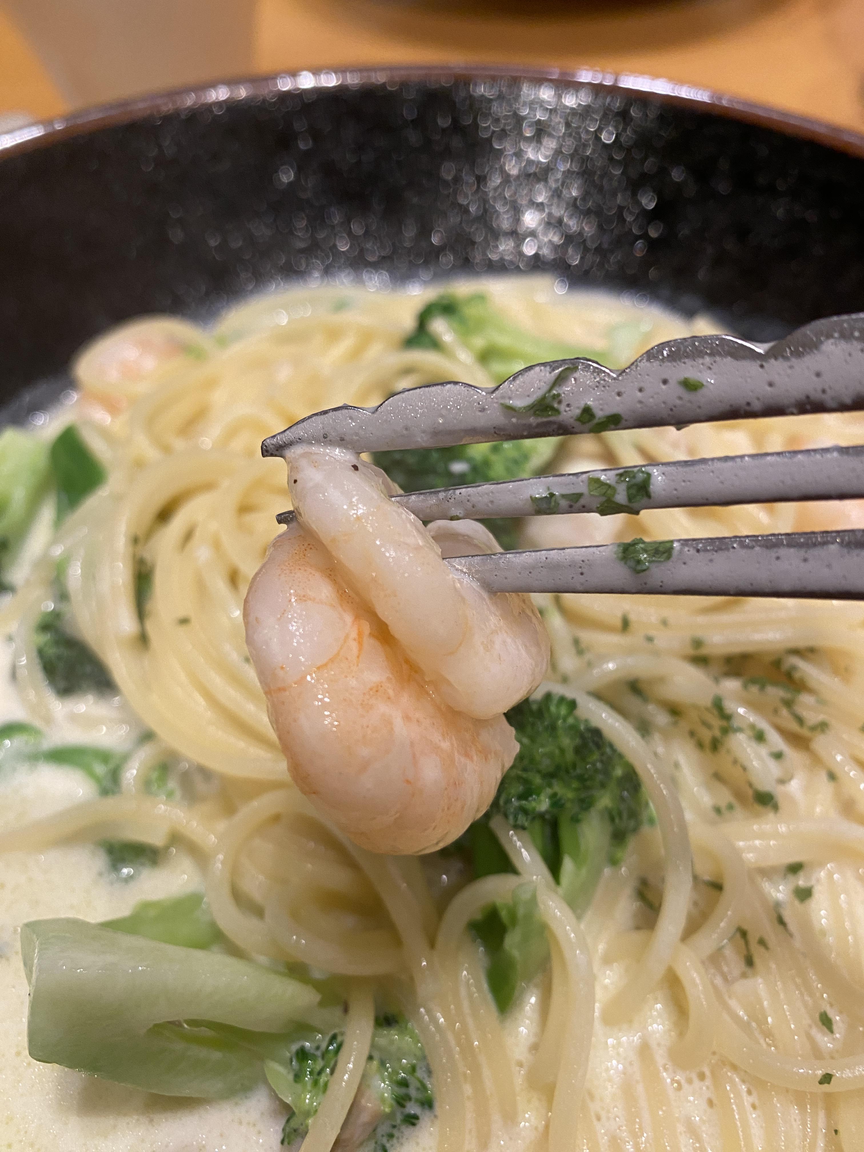 브로콜리가 메인답게 브로콜리 양이 굉장히 많아요! 그리고 새우도 양이 많습니다 ㅎㅎ 저는 한국에서 까르보나라를 처음 먹었을 때 안에 들어있는 브로콜리가 너무 맛있었는데 양이 너무 적어서 아쉬웠던 적이 한두 번이 아니었어요... 입맛이 특이해서 그런가 브로콜리가 너무 좋더라고요 ㅎㅎㅎ