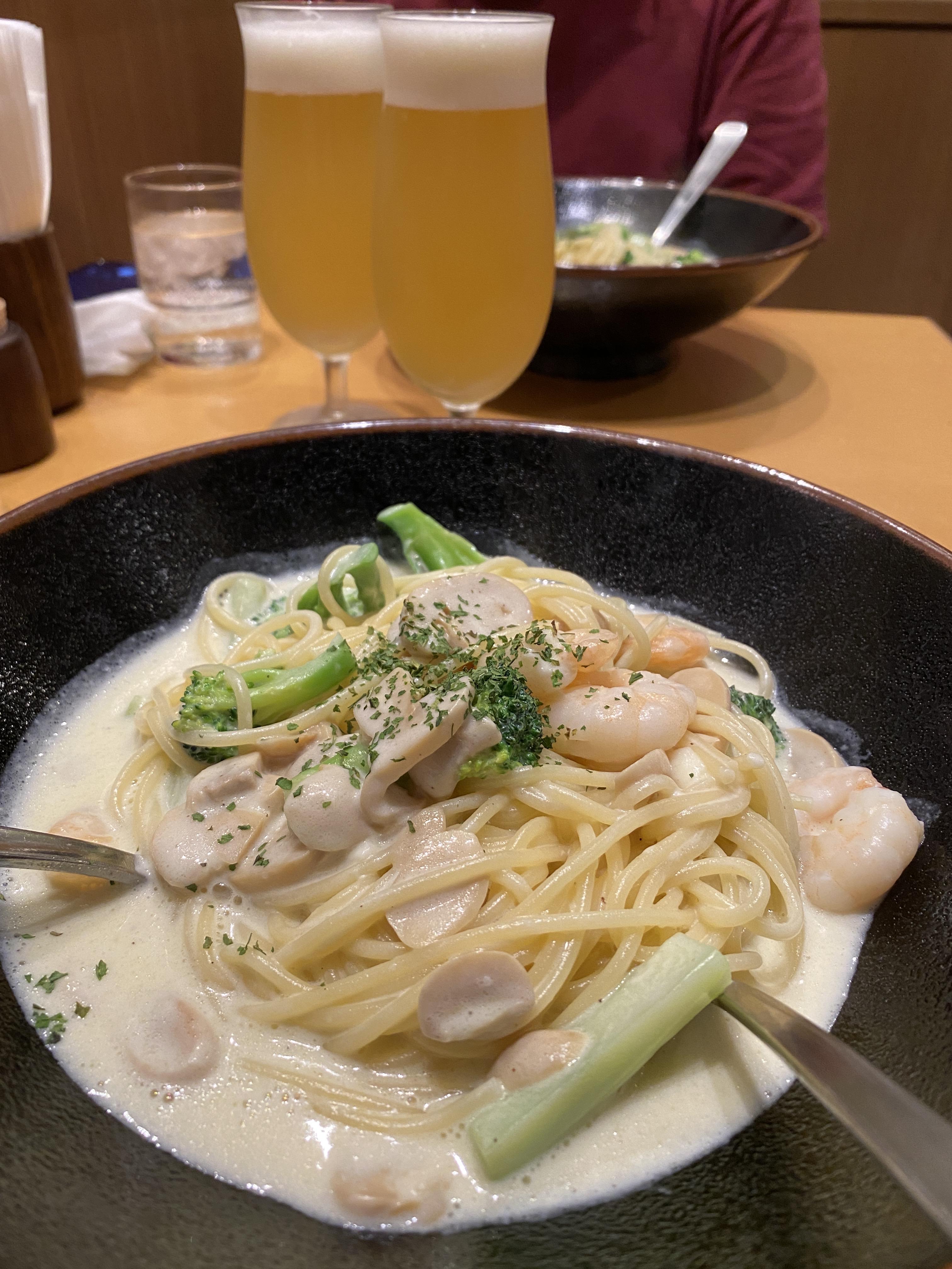 그리고 이 가게는 파스타와 피자 가게이기 때문에 피자 메뉴도 있어요. 저희는 배가 어느 정도 부르기 때문에 파스타만 주문했고 생맥주도 한잔씩 주문했습니다. ㅎㅎ(맥주를 빼놓을 순 없죠)