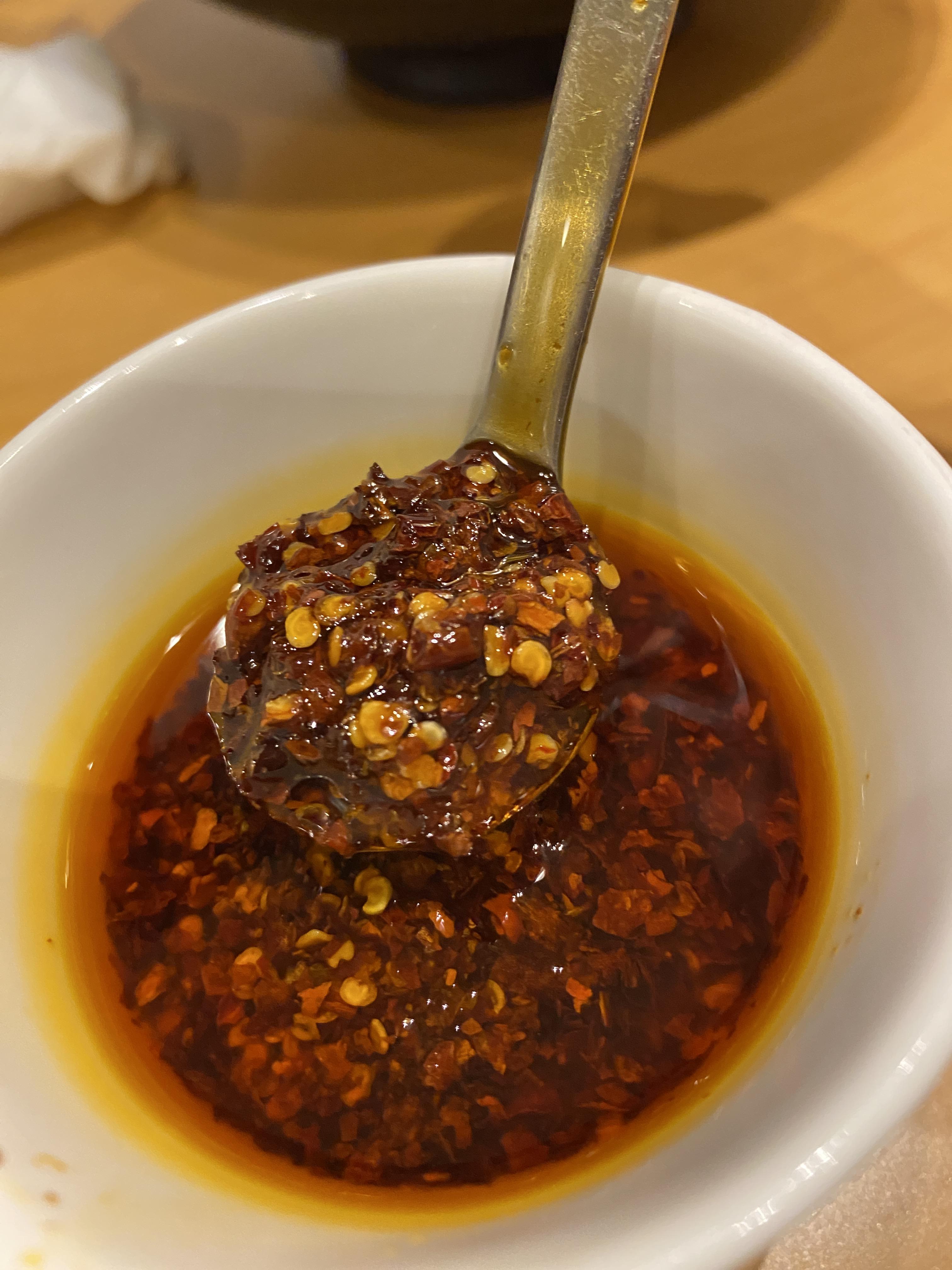 그리고 메뉴가 나올 때 고추기름? 같은걸 주는데 이걸 넣어도 맛이 확 바뀌어서 진짜 맛있습니다. 생각보다 매워서 많이 넣으시면 안돼요! 사진에 제가 넣은 만큼만 넣으셔도 충분하니 조금씩 넣어 보시고 점점 양을 늘리셔야 합니다!(사실 전 맵 찔이)