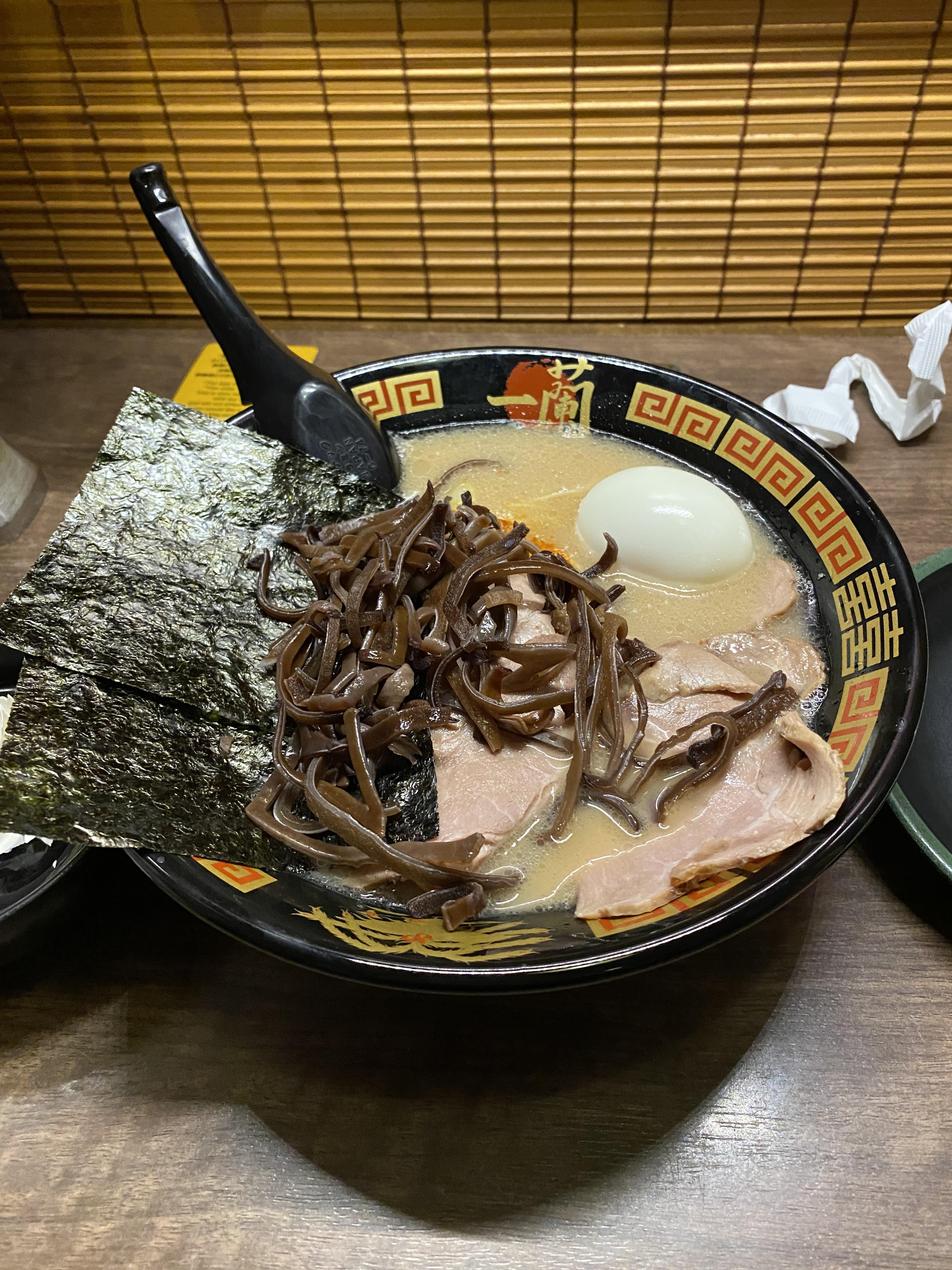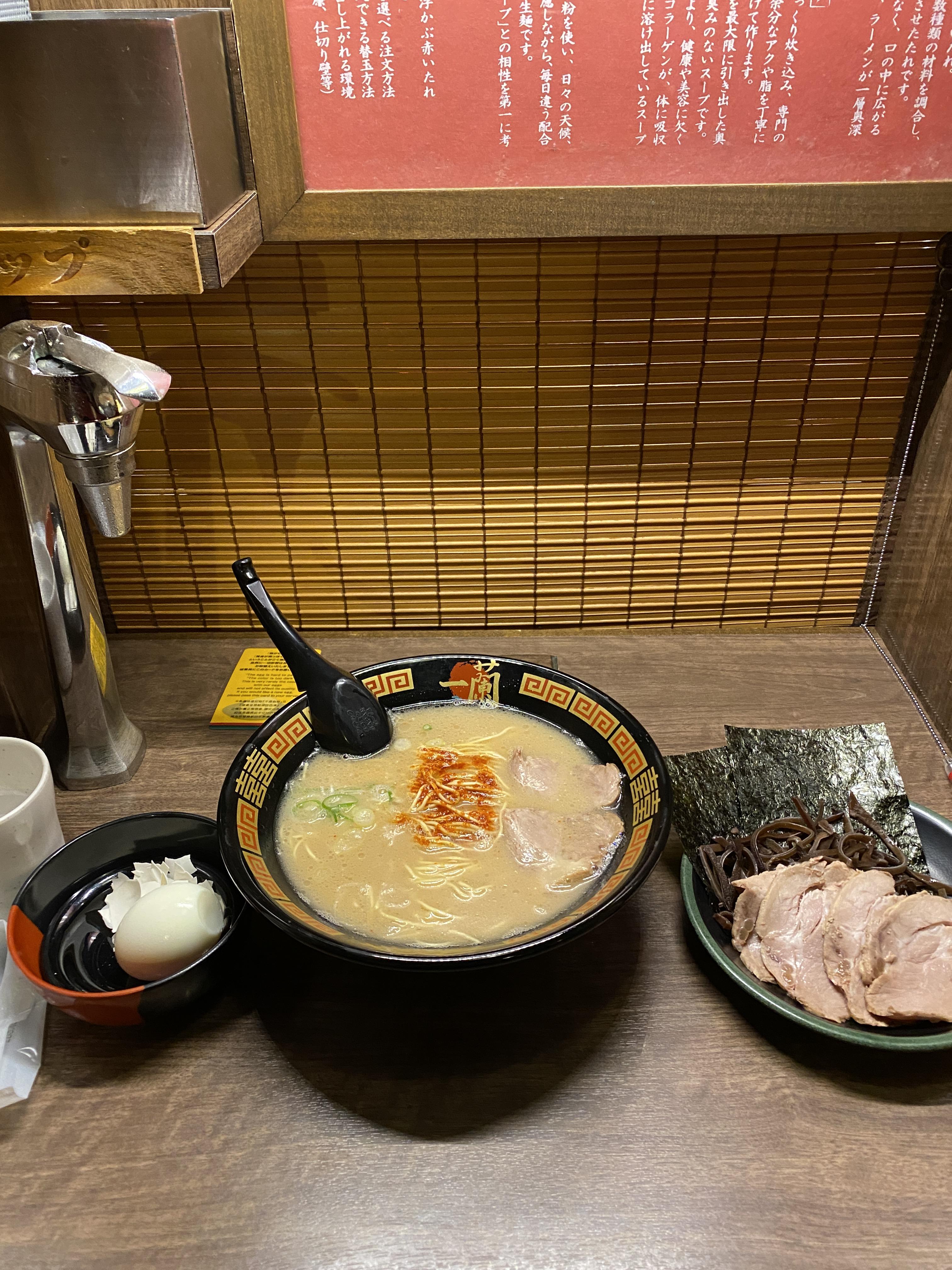 저는 꼬들한 면이 좋으니 약간 덜 익힘 면을 주문했어요. 챠슈도 따뜻하니 먹기 좋습니다. 이치란 라면은 후쿠오카에서 시작됐듯이 돈코츠라면이 베이스예요. 일본은 국물 베이스로 종류가 많이 나뉘는데 돈코츠는 돼지고기 뼈로 우려낸 국물입니다.
