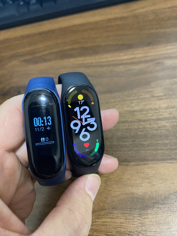 여태까지 3년 넘게 사용한 샤오미 미 밴드 3와 비교... 컬러도 아니고 화면도 굉장히 작기 때문에 많이 미밴드 7과 비교하니 너무 초라해 보이더군요... 3야 그동안 고생했다...